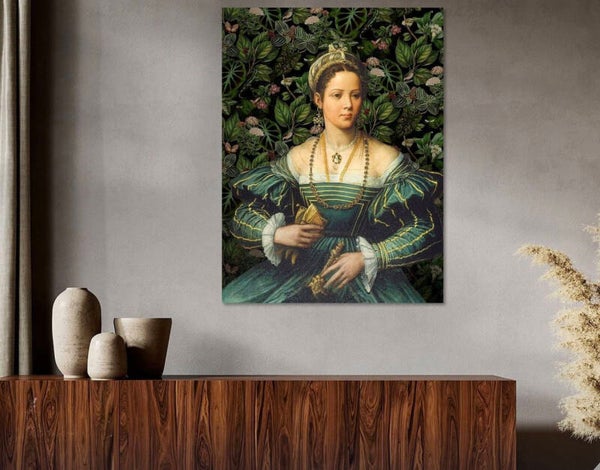 Een Prachtig Portret van een Renaissance Dame in het Groen. Rijkelijke Versierd met Gouden Stiksels en Sierraden.